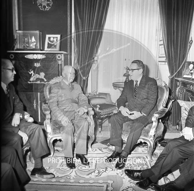 El Secretario de Estado de Exteriores Mr. Henry Kissinger, acompañado del Ministro de AA.EE. españón Sr. López Rodó, es recibido en El Pardo por el Jefe del Estado Francisco Franco.