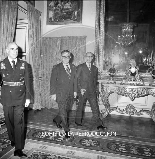 El Secretario de Estado de Exteriores Mr. Henry Kissinger, acompañado del Ministro de AA.EE. españón Sr. López Rodó, es recibido en El Pardo por el Jefe del Estado Francisco Franco.