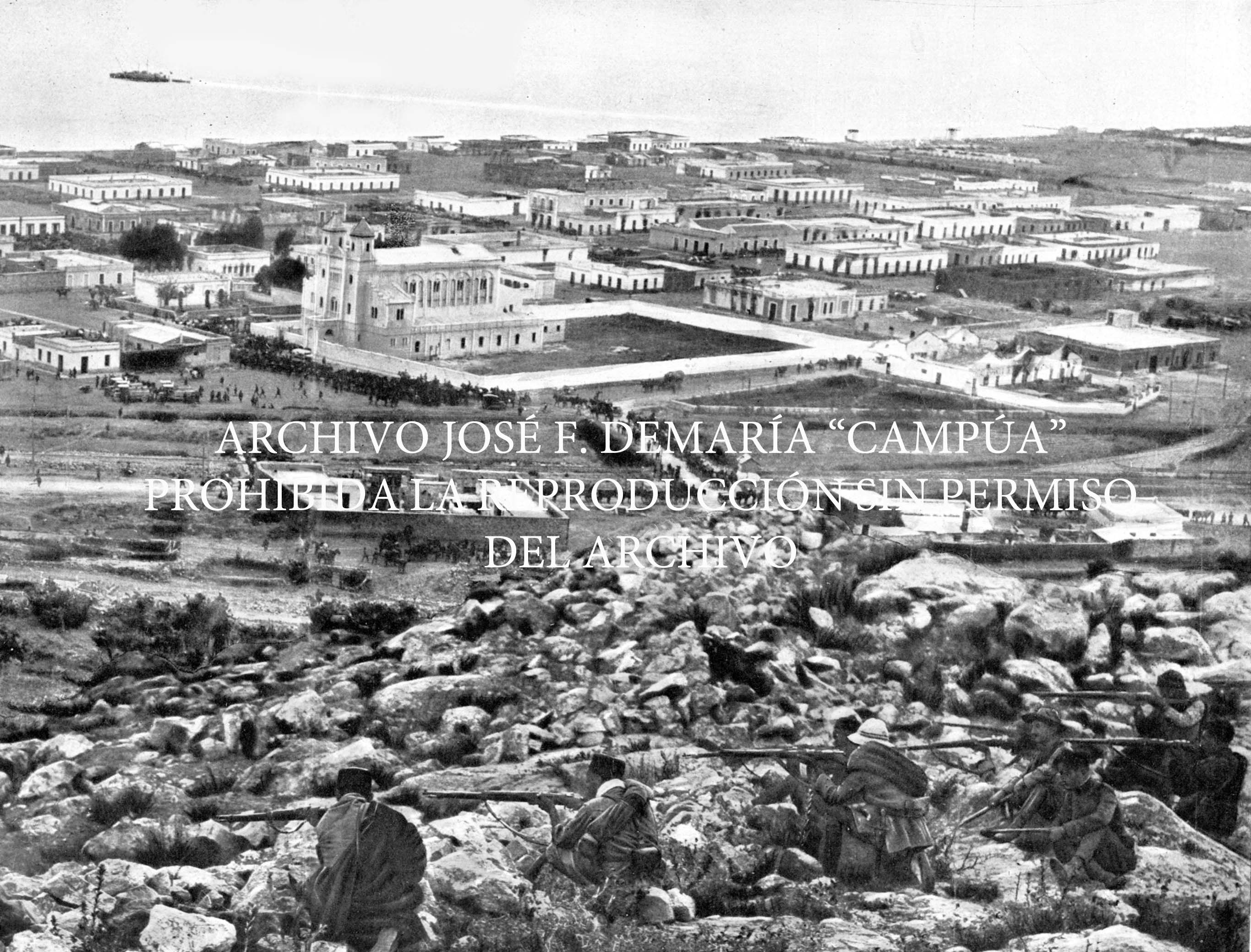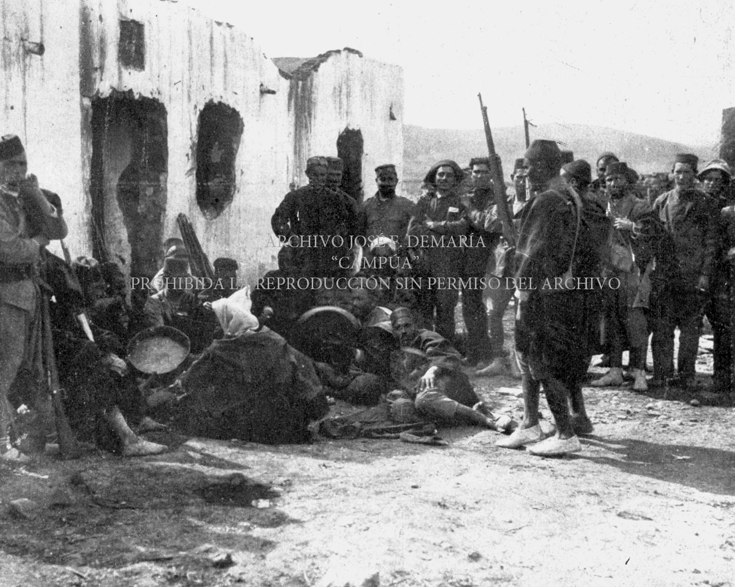 Tropas españolas combatiendo a los moros desde el blocao construido en las cercanías del zoco El-Arbaa de Akerman, después de ocupada esta posición por los soldados españoles, para proteger el avance hacia Nador. |