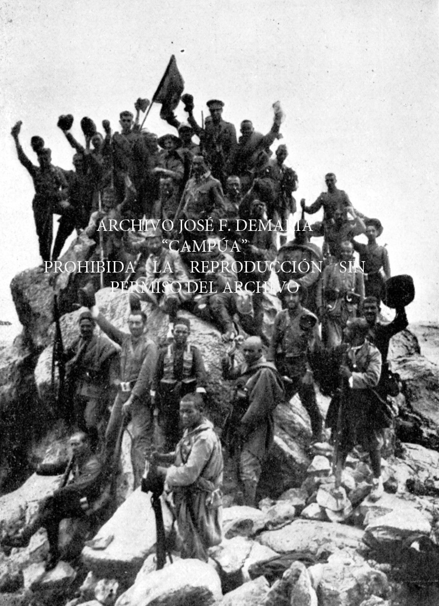 Fuerzas de Regulares y del Tercio de Extranjero en el pico más alto de las Tetas de Nador, donde se plantó la bandera de España. |