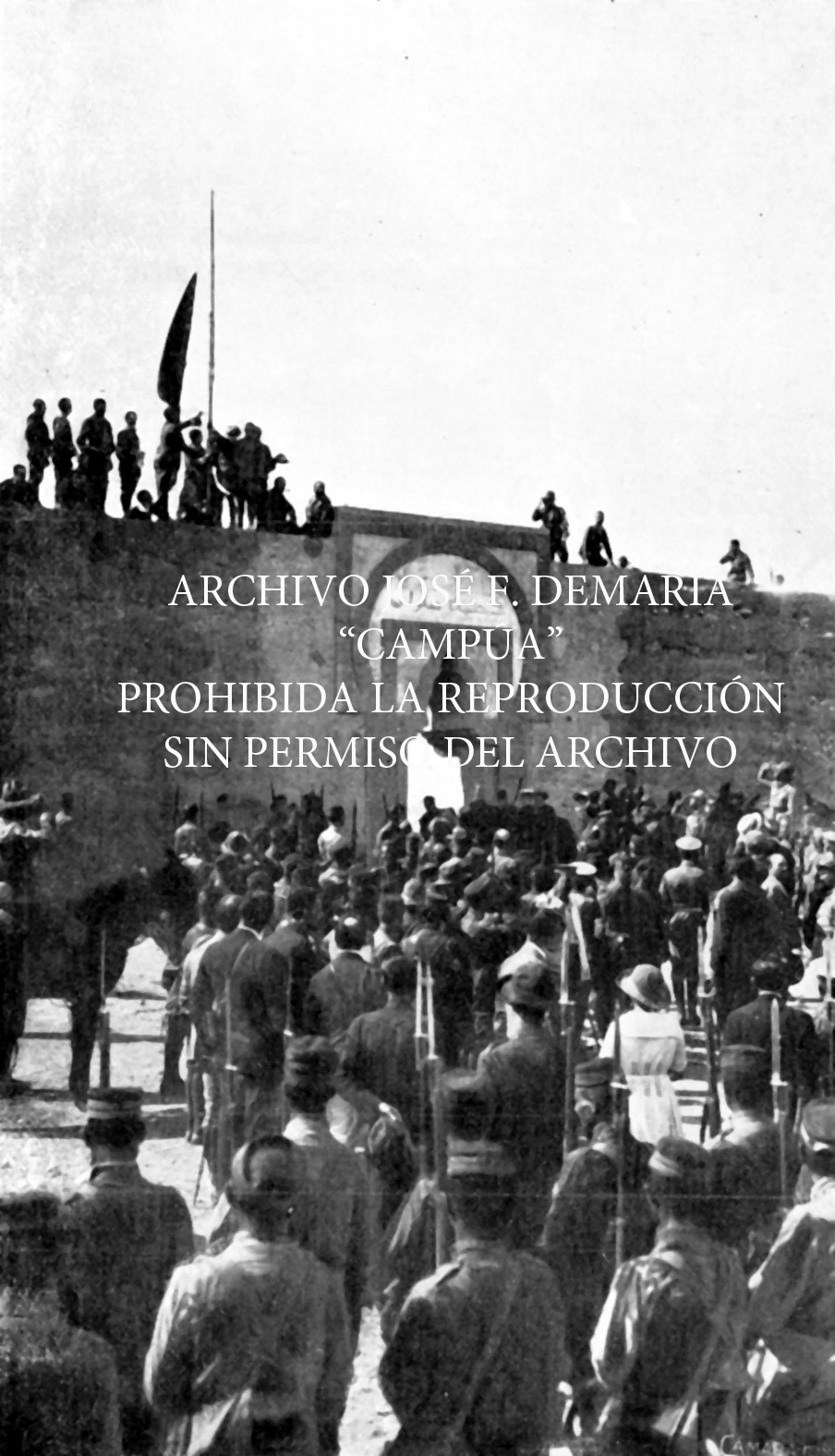 Izado de bandera en la cima del monte Gurugú, tomada por Campúa el 10 de octubre de 1921. |