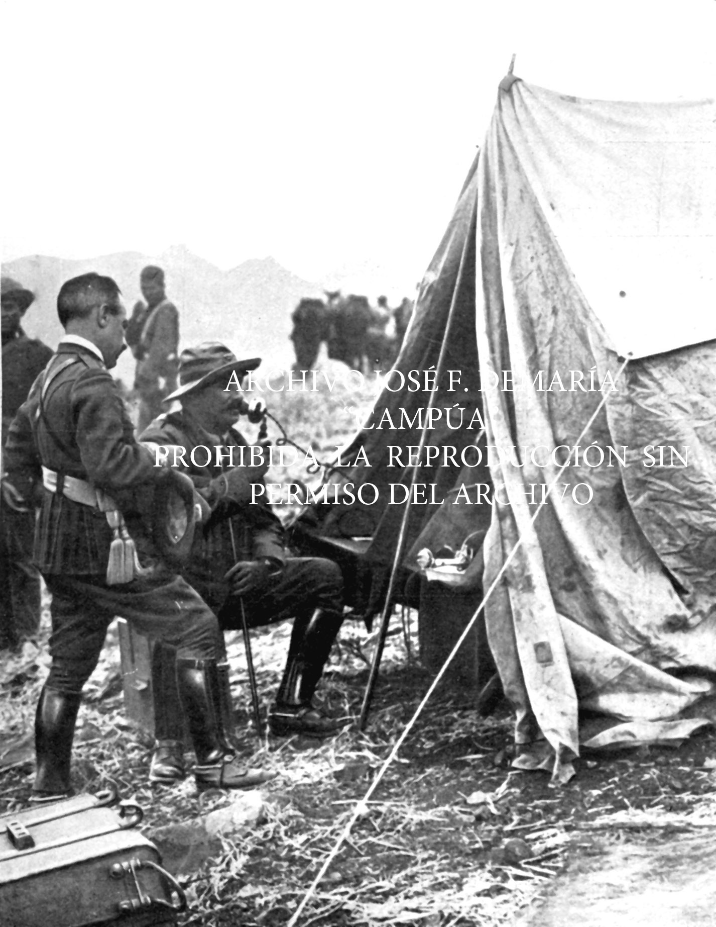 El Alto Comisario, General Berenguer, dando ordenes por radio a las columnas del genera Sanjurjo durante el avance hacia Monte Arruit que fue tomado por las tropas de Sanjurjo, Cabanellas y Berenguer el 24 de octubre de 1921. |