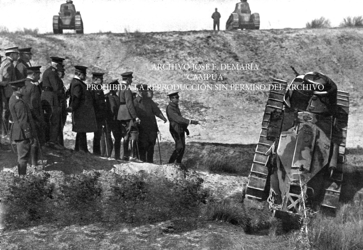 Alfonso XIII con el Ministro de la Guerra y altas personalidades militares, presenciando las pruebas de los diez tanques de guerra que van a ser enviados al ejército |