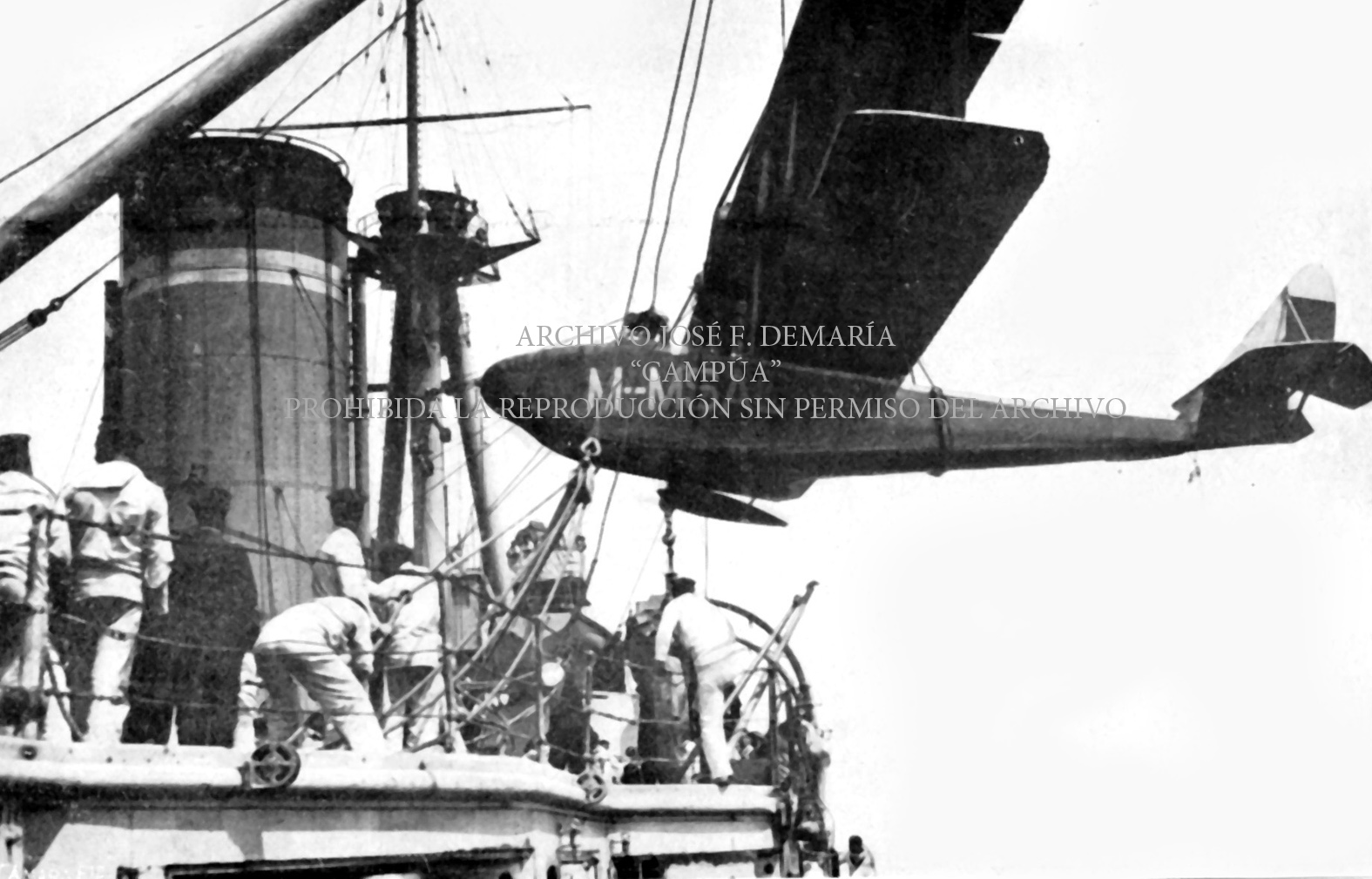 El hidroavión en el que iba Campúa y que cayó al mar por avería, pilotado por el Capitán Ramón Franco, en la cubierta del Alfonso XIII. |