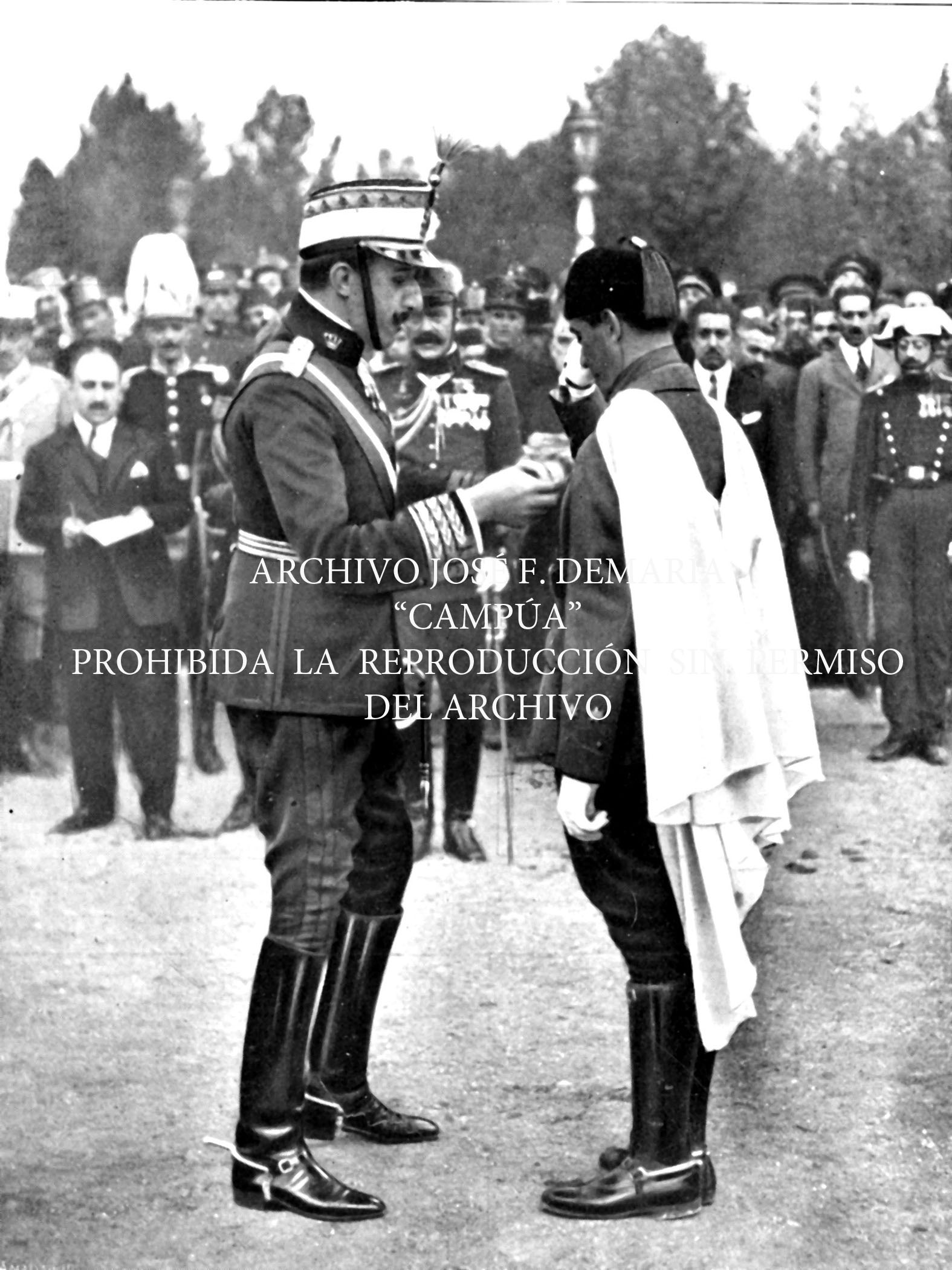 Alfonso XIII impone dos cruces Laureadas de San Fernando al Capitán Varela de los Regulares de Larache por su heroico comportamiento en las campañas de Africa. |