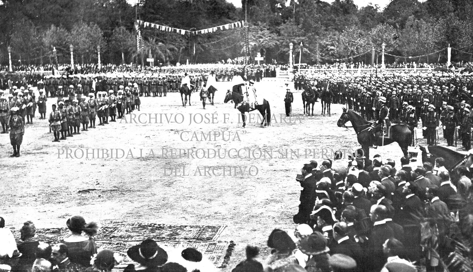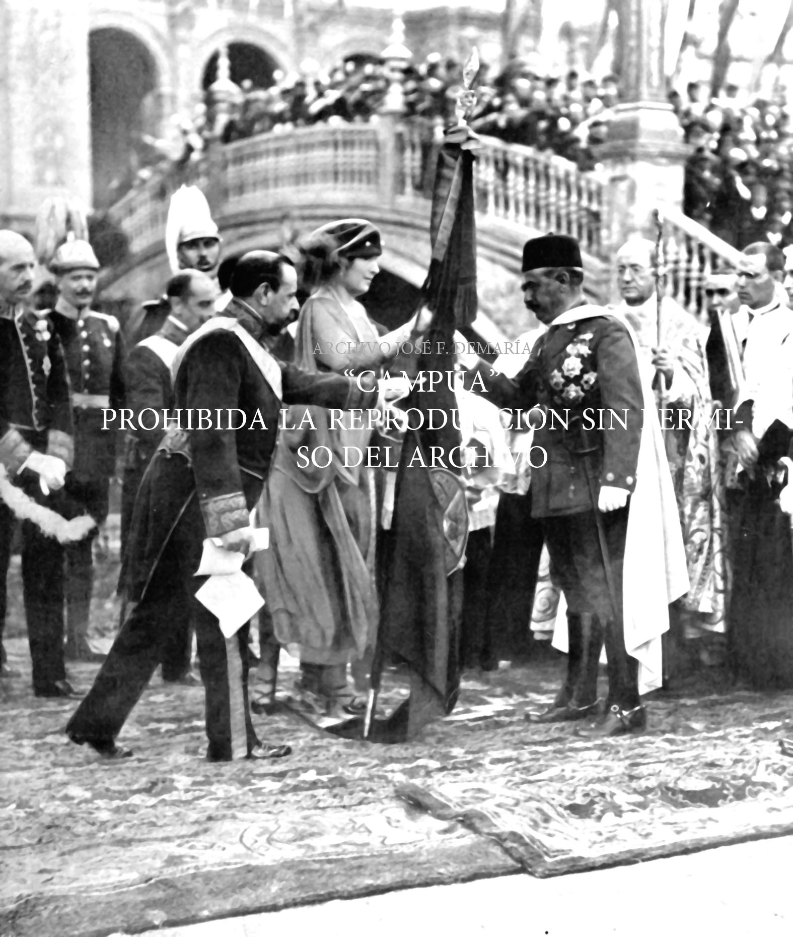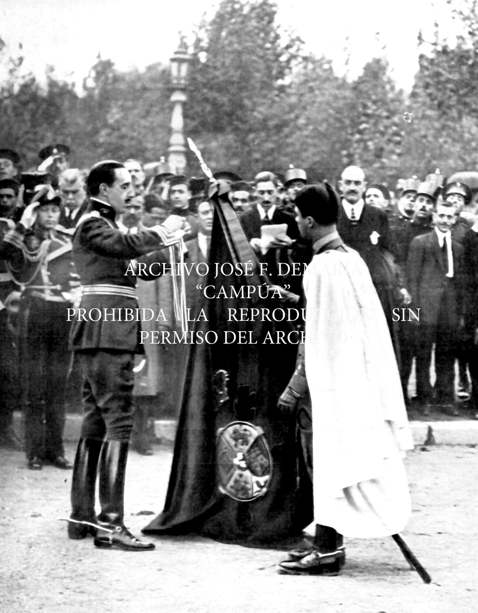 Alfonso XIII impone la corbata del Merito Militar a la bandera de los Regulares de Larache, que le ha sido regalada por el pueblo de Sevilla. |