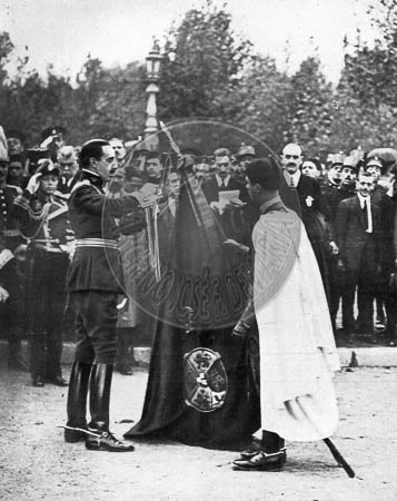 El Rey Alfonso XIII impone la corbata del Merito Militar a la Bandera de Regulares de Larache.