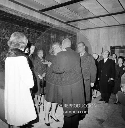 Franco, con los Príncipes de España reciben y despiden en Barajas al Rey de Grecia. Les acompañan el Ministro de Asuntos Exteriores Sr. Castiella, del Ejercito Gral. Martin Alonso, de la Gobernación Gral. Camilo Alonso Vega y del Aire Gral. Lacalle, así como el Infante D. Alfonso de Orleans.