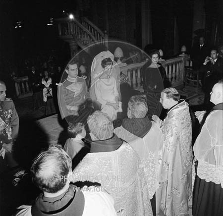 Boda de la Princesa Mª Teresa de Baviera (Tessa de Baviera) con D. Alfonso Márquez y Patiño, en San Francisco el Grande. Príncipes de España de testigos. Duquesa de Alba, Alfonso de Borbón, Gutiérrez Mellado de Coronel entre los invitados, Carrero Blanco.