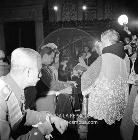 Boda de la Princesa Mª Teresa de Baviera (Tessa de Baviera) con D. Alfonso Márquez y Patiño, en San Francisco el Grande. Príncipes de España de testigos. Duquesa de Alba, Alfonso de Borbón, Gutiérrez Mellado de Coronel entre los invitados, Carrero Blanco.