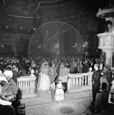 Boda de la Princesa Mª Teresa de Baviera (Tessa de Baviera) con D. Alfonso Márquez y Patiño, en San Francisco el Grande. Príncipes de España de testigos. Duquesa de Alba, Alfonso de Borbón, Gutiérrez Mellado de Coronel entre los invitados, Carrero Blanco.