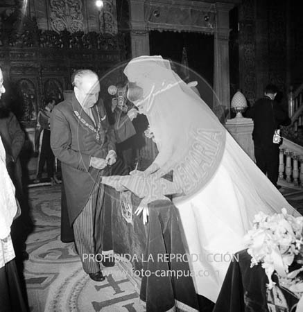 Boda de la Princesa Mª Teresa de Baviera (Tessa de Baviera) con D. Alfonso Márquez y Patiño, en San Francisco el Grande. Príncipes de España de testigos. Duquesa de Alba, Alfonso de Borbón, Gutiérrez Mellado de Coronel entre los invitados, Carrero Blanco.