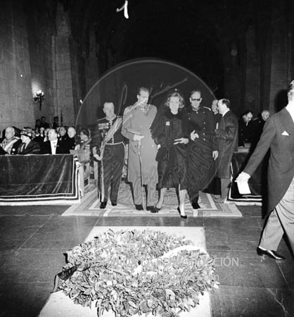 Los Príncipes de España asisten al solemne Tedeum, presidido por El Jefe del Estado y con asistencia del Gobierno en Pleno, por los XXV años de Paz. Los Príncipes ante la tumba de José Antonio.