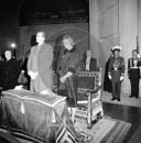 Los Príncipes de España asisten al solemne Tedeum, presidido por El Jefe del Estado y con asistencia del Gobierno en Pleno, por los XXV años de Paz. Los Príncipes ante la tumba de José Antonio.