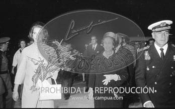 Los Príncipes de España D. Juan Carlos y Dª Sofía, con el Caudillo y su esposa, reciben al Rey Constantino de Grecia en Barajas. D. Juan Carlos besando la mano a Dª Carmen.