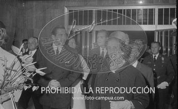Los Príncipes de España D. Juan Carlos y Dª Sofía, con el Caudillo y su esposa, reciben al Rey Constantino de Grecia en Barajas. D. Juan Carlos besando la mano a Dª Carmen.