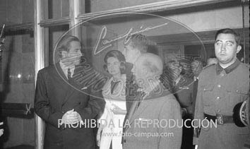 Los Príncipes de España D. Juan Carlos y Dª Sofía, con el Caudillo y su esposa, reciben al Rey Constantino de Grecia en Barajas. D. Juan Carlos besando la mano a Dª Carmen.