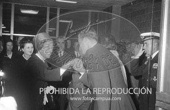 Los Príncipes de España D. Juan Carlos y Dª Sofía, con el Caudillo y su esposa, reciben al Rey Constantino de Grecia en Barajas. D. Juan Carlos besando la mano a Dª Carmen.