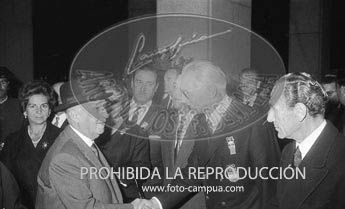 Los Príncipes de España D. Juan Carlos y Dª Sofía, con el Caudillo y su esposa, reciben al Rey Constantino de Grecia en Barajas. D. Juan Carlos besando la mano a Dª Carmen.