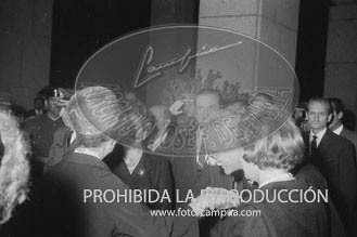 Los Príncipes de España D. Juan Carlos y Dª Sofía, con el Caudillo y su esposa, reciben al Rey Constantino de Grecia en Barajas. D. Juan Carlos besando la mano a Dª Carmen.