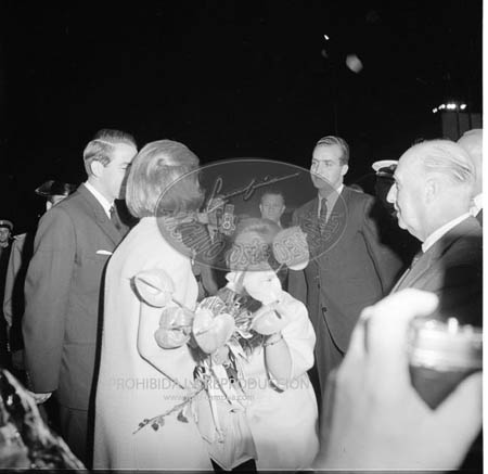 Los Príncipes de España D. Juan Carlos y Dª Sofía, con el Caudillo y su esposa, reciben al Rey Constantino de Grecia en Barajas. D. Juan Carlos besando la mano a Dª Carmen.