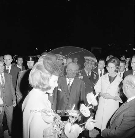 Los Príncipes de España D. Juan Carlos y Dª Sofía, con el Caudillo y su esposa, reciben al Rey Constantino de Grecia en Barajas. D. Juan Carlos besando la mano a Dª Carmen.
