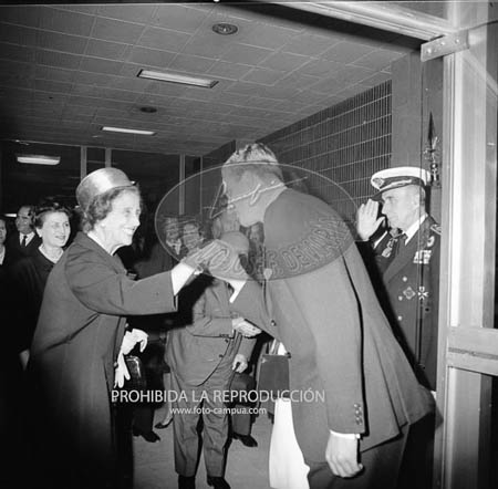 Los Príncipes de España D. Juan Carlos y Dª Sofía, con el Caudillo y su esposa, reciben al Rey Constantino de Grecia en Barajas. D. Juan Carlos besando la mano a Dª Carmen.