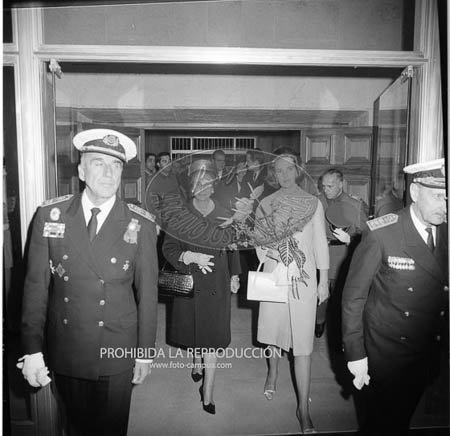 Los Príncipes de España D. Juan Carlos y Dª Sofía, con el Caudillo y su esposa, reciben al Rey Constantino de Grecia en Barajas. D. Juan Carlos besando la mano a Dª Carmen.