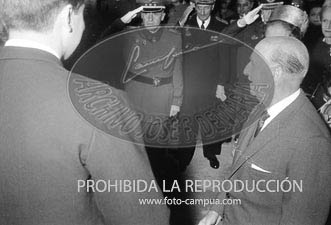 Los Príncipes de España D. Juan Carlos y Dª Sofía, con el Caudillo y su esposa, reciben al Rey Constantino de Grecia en Barajas. D. Juan Carlos besando la mano a Dª Carmen.