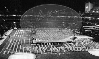 Los Príncipes de España asisten a la demostración sindical en el estadio Santiago Bernabéu, en la tribuna el Rey Simeón de Bulgaria.