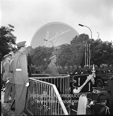 XXVII Desfile de la Victoria. El Caudillo con los Príncipes de España, el Rey Simeón y el Infante D. Alfonso de Borbón.