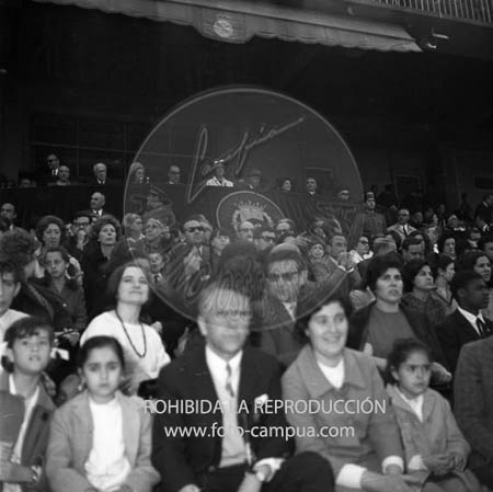 El Caudillo y los Príncipes de España presidiendo la XI demostración sindical en el Estadio Santiago Bernabéu. D. Juan Carlos, Dª Sofía y D Alfonso juntos.