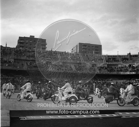 El Caudillo y los Príncipes de España presidiendo la XI demostración sindical en el Estadio Santiago Bernabéu. D. Juan Carlos, Dª Sofía y D Alfonso juntos.