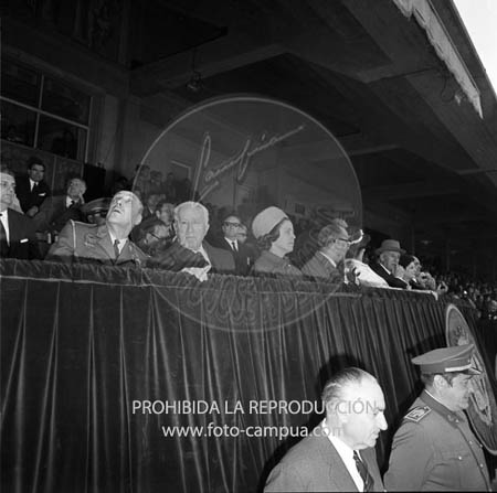 El Caudillo y los Príncipes de España presidiendo la XI demostración sindical en el Estadio Santiago Bernabéu. D. Juan Carlos, Dª Sofía y D Alfonso juntos.