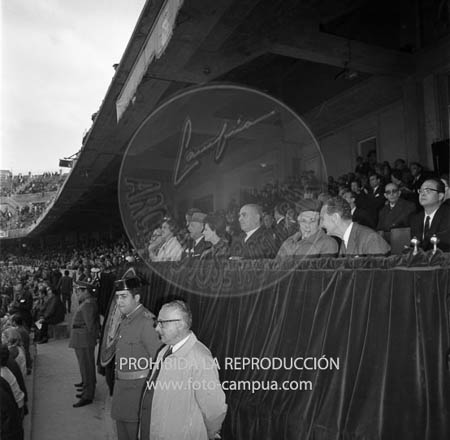 El Caudillo y los Príncipes de España presidiendo la XI demostración sindical en el Estadio Santiago Bernabéu. D. Juan Carlos, Dª Sofía y D Alfonso juntos.