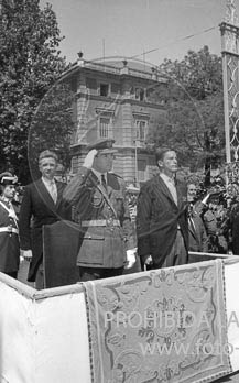XXVI Desfile de la Victoria, preside El Caudillo con el Príncipe Juan Carlos y el Príncipe Muley Abdullah, hermano del Rey de Marruecos. En la tribuna Dª Carmen con la Princesa Sofía y el Rey Simeón de Bulgaria con el Duque de Cádiz.