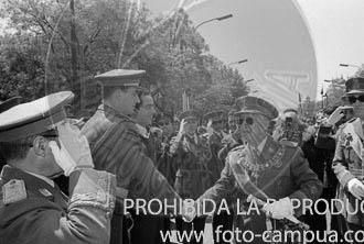 XXVI Desfile de la Victoria, preside El Caudillo con el Príncipe Juan Carlos y el Príncipe Muley Abdullah, hermano del Rey de Marruecos. En la tribuna Dª Carmen con la Princesa Sofía y el Rey Simeón de Bulgaria con el Duque de Cádiz.