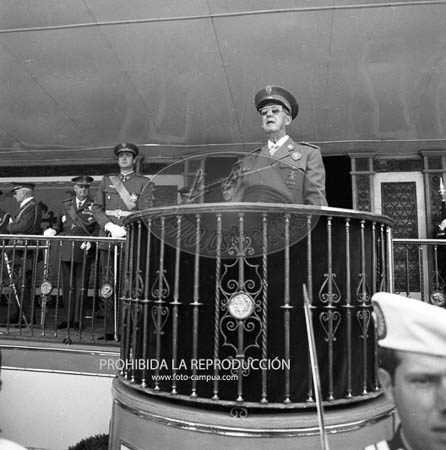 Franco con el Príncipe, presiden el Desfile de la Victoria. El Rey Simeón de Bulgaria en la tribuna con el Infante D. Alfonso de Borbón de uniforme de Alférez de la Milicia Aérea Universitaria. El Príncipe con el Almirante Carrero Blanco