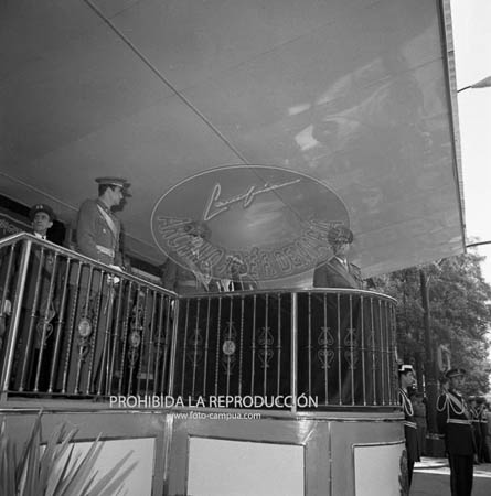 Franco con el Príncipe, presiden el Desfile de la Victoria. El Rey Simeón de Bulgaria en la tribuna con el Infante D. Alfonso de Borbón de uniforme de Alférez de la Milicia Aérea Universitaria. El Príncipe con el Almirante Carrero Blanco