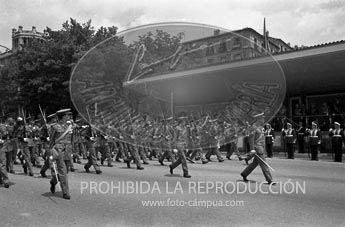 Franco con el Príncipe, presiden el Desfile de la Victoria. El Rey Simeón de Bulgaria en la tribuna con el Infante D. Alfonso de Borbón de uniforme de Alférez de la Milicia Aérea Universitaria. El Príncipe con el Almirante Carrero Blanco