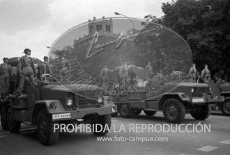 Franco con el Príncipe, presiden el Desfile de la Victoria. El Rey Simeón de Bulgaria en la tribuna con el Infante D. Alfonso de Borbón de uniforme de Alférez de la Milicia Aérea Universitaria. El Príncipe con el Almirante Carrero Blanco