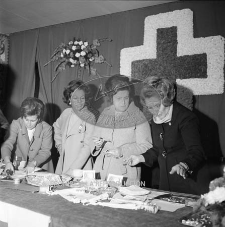 Mesa de cuestación de la Cruz Roja Española, presidiendo la mesa Dª Carmen Polo acompañada de la Princesa de España y otras personalidades