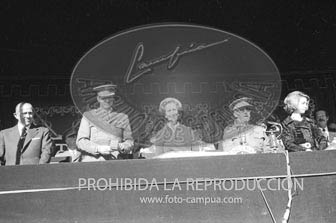 Los Príncipes de España ante una manifestación de mas de 17.000 jóvenes en El Pardo, con motivo del 34 aniversario de la fundación de la Organización Juvenil Española.