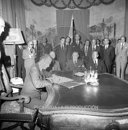 El Príncipe de España D. Juan Carlos, firma por primera vez como Jefe del Estado, por enfermedad del Caudillo, con motivo de la firma del convenio con EE.UU.