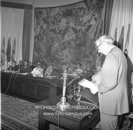 El Príncipe D. Juan Carlos acompaña al Jefe del estado en el acto conmemorativo del Centenario de la fundación del Banco de España. Pronuncia el discurso el Ministro de Hacienda D. Antonio Barrera de Irimo. Asiste el Consejo del Banco con su presidente D. Luis Coronel de Palma, Marqués de Tejada.