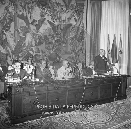 El Príncipe D. Juan Carlos acompaña al Jefe del estado en el acto conmemorativo del Centenario de la fundación del Banco de España. Pronuncia el discurso el Ministro de Hacienda D. Antonio Barrera de Irimo. Asiste el Consejo del Banco con su presidente D. Luis Coronel de Palma, Marqués de Tejada.
