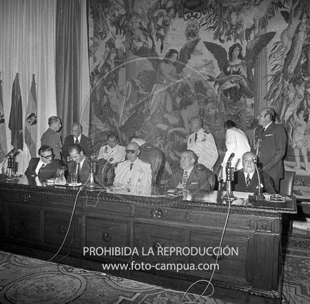 El Príncipe D. Juan Carlos acompaña al Jefe del estado en el acto conmemorativo del Centenario de la fundación del Banco de España. Pronuncia el discurso el Ministro de Hacienda D. Antonio Barrera de Irimo. Asiste el Consejo del Banco con su presidente D. Luis Coronel de Palma, Marqués de Tejada.