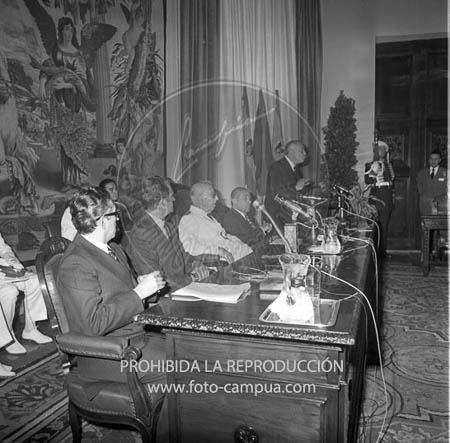 El Príncipe D. Juan Carlos acompaña al Jefe del estado en el acto conmemorativo del Centenario de la fundación del Banco de España. Pronuncia el discurso el Ministro de Hacienda D. Antonio Barrera de Irimo. Asiste el Consejo del Banco con su presidente D. Luis Coronel de Palma, Marqués de Tejada.