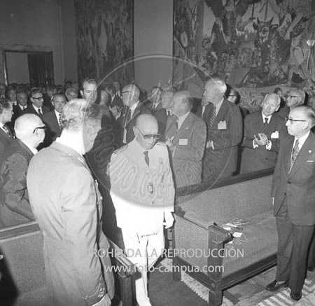 El Príncipe D. Juan Carlos acompaña al Jefe del estado en el acto conmemorativo del Centenario de la fundación del Banco de España. Pronuncia el discurso el Ministro de Hacienda D. Antonio Barrera de Irimo. Asiste el Consejo del Banco con su presidente D. Luis Coronel de Palma, Marqués de Tejada.