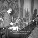El Príncipe D. Juan Carlos acompaña al Jefe del estado en el acto conmemorativo del Centenario de la fundación del Banco de España. Pronuncia el discurso el Ministro de Hacienda D. Antonio Barrera de Irimo. Asiste el Consejo del Banco con su presidente D. Luis Coronel de Palma, Marqués de Tejada.